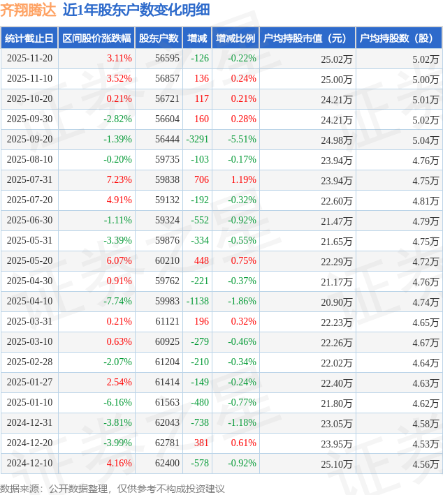 从股价来看,2025年10月20日至2025年11月20日,齐翔腾达区间涨幅为3.11%,在此期间股东户数减少126.0户,减幅为0.22%。