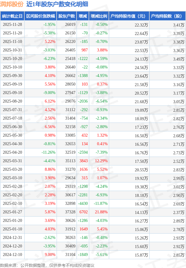 从股价来看,2025年11月20日至2025年11月28日,润邦股份区间跌幅为1.95%,在此期间股东户数减少131.0户,减幅为0.5%。