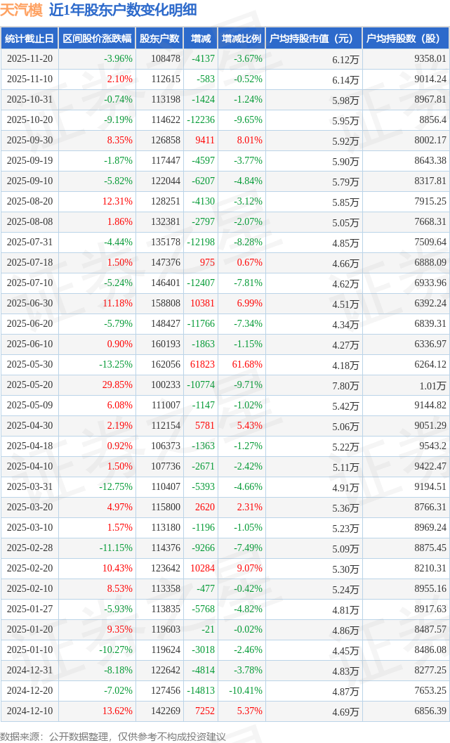从股价来看,2025年11月10日至2025年11月20日,天汽模区间跌幅为3.96%,在此期间股东户数减少4137.0户,减幅为3.67%。