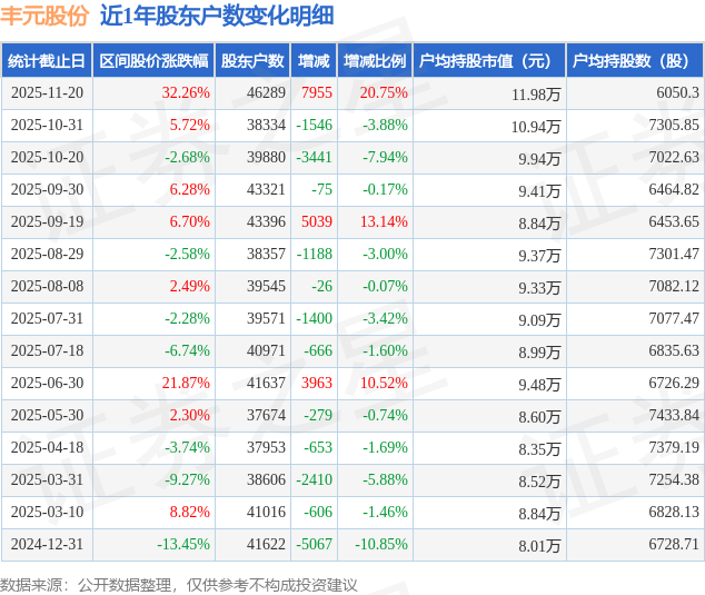 从股价来看,2025年10月31日至2025年11月20日,丰元股份区间涨幅为32.26%,在此期间股东户数增加7955.0户,增幅为20.75%。