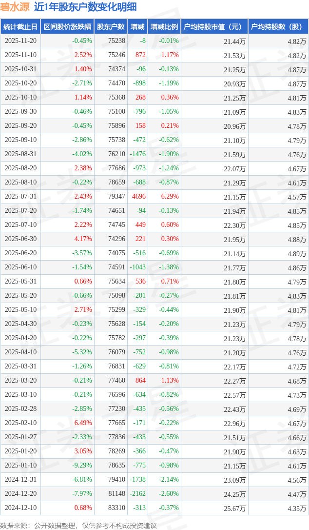 从股价来看,2025年11月10日至2025年11月20日,碧水源区间跌幅为0.45%,在此期间股东户数减少8.0户,减幅为0.01%。