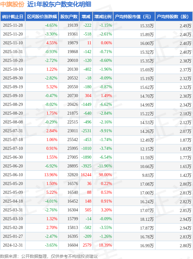 从股价来看,2025年11月20日至2025年11月28日,中旗股份区间跌幅为4.65%,在此期间股东户数减少222.0户,减幅为1.15%。