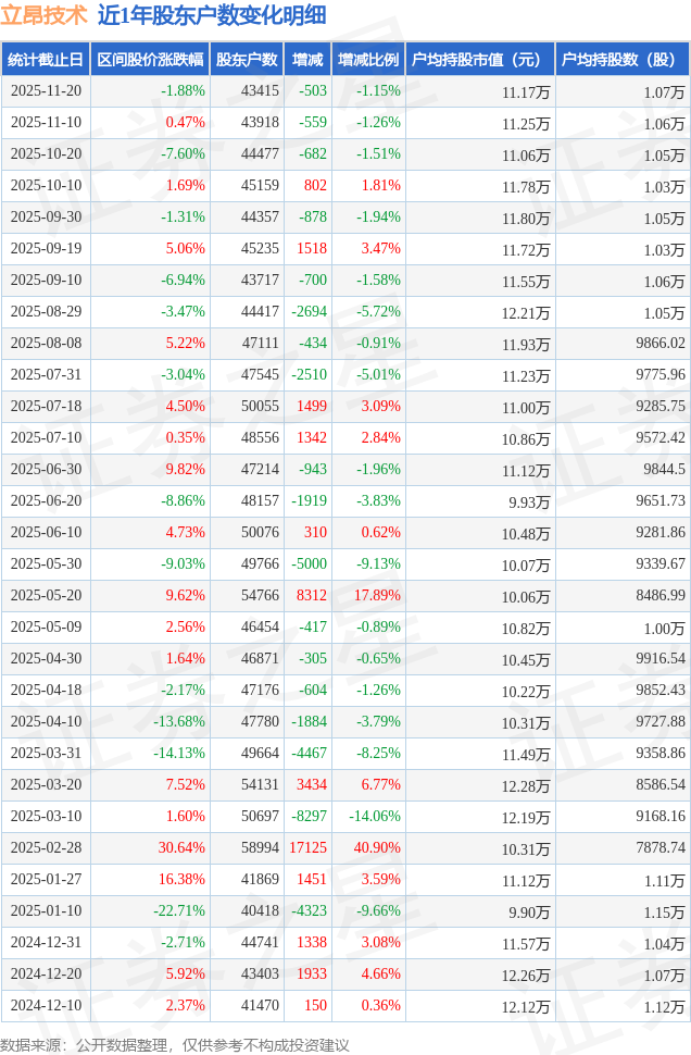 从股价来看,2025年11月10日至2025年11月20日,立昂技术区间跌幅为1.88%,在此期间股东户数减少503.0户,减幅为1.15%。