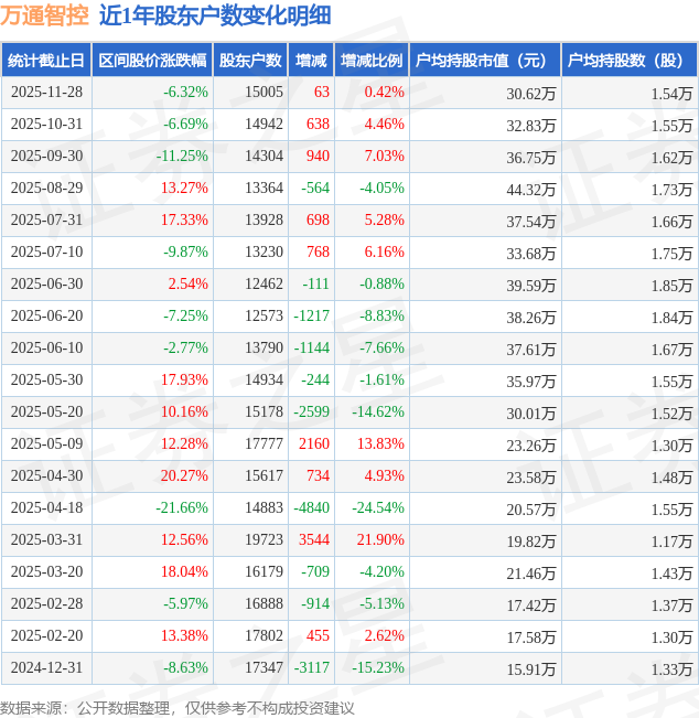 从股价来看,2025年10月31日至2025年11月28日,万通智控区间跌幅为6.32%,在此期间股东户数增加63.0户,增幅为0.42%。