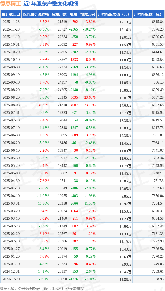 从股价来看,2025年11月20日至2025年11月28日,德恩精工区间涨幅为3.79%,在此期间股东户数增加792.0户,增幅为3.82%。
