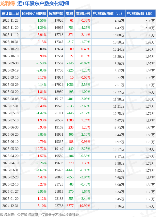 从股价来看,2025年11月20日至2025年11月28日,龙利得区间跌幅为1.56%,在此期间股东户数增加61.0户,增幅为0.36%。
