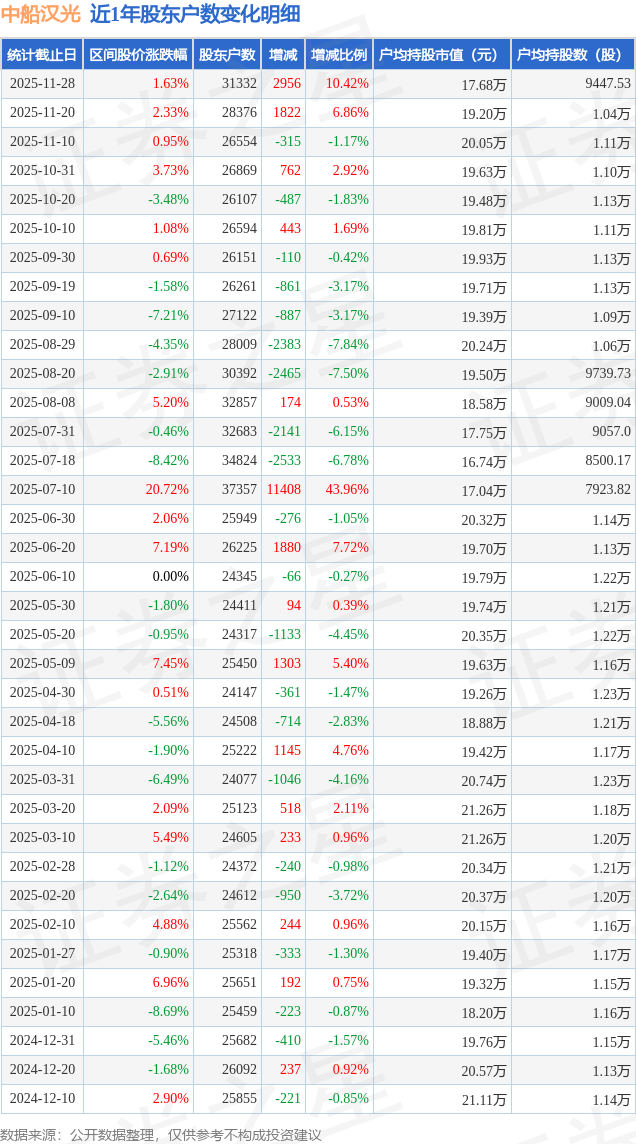 证券之星消息,近日中船汉光披露,截至2025年11月28日公司股东户数为3.13万户,较11月20日增加2956.0户,增幅为10.42%。户均持股数量由上期的1.04万股减少至9448.0股,户均持股市值为17.68万元。