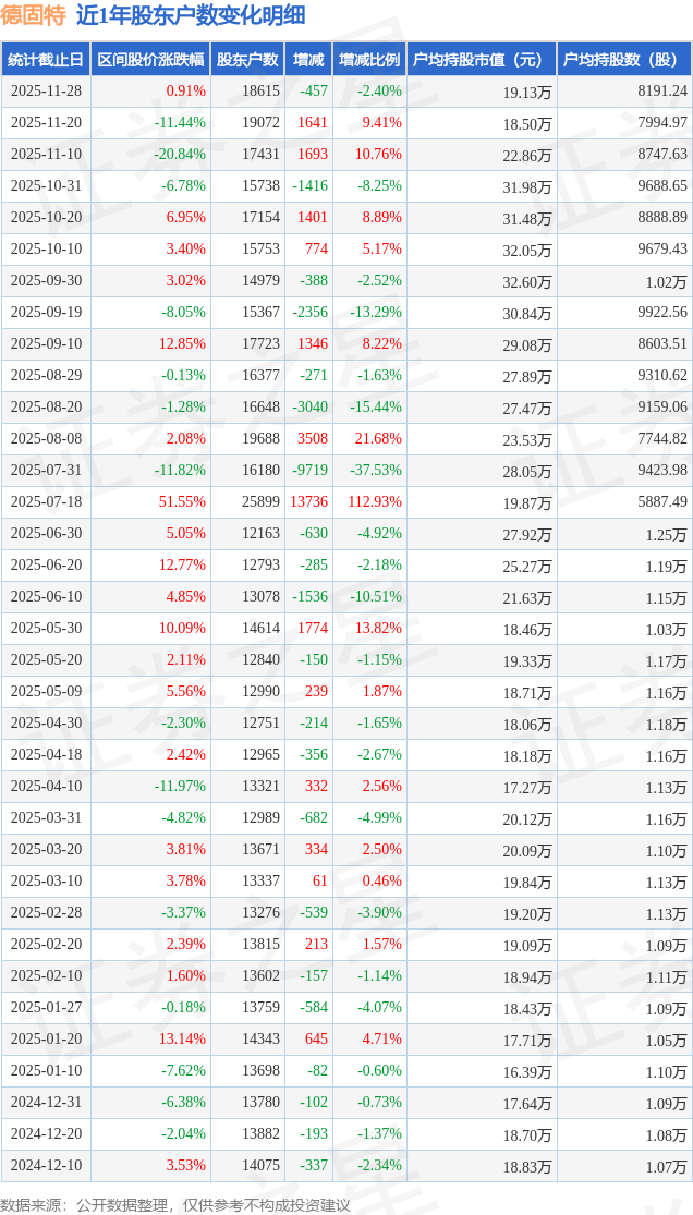 从股价来看,2025年11月20日至2025年11月28日,德固特区间涨幅为0.91%,在此期间股东户数减少457.0户,减幅为2.4%。