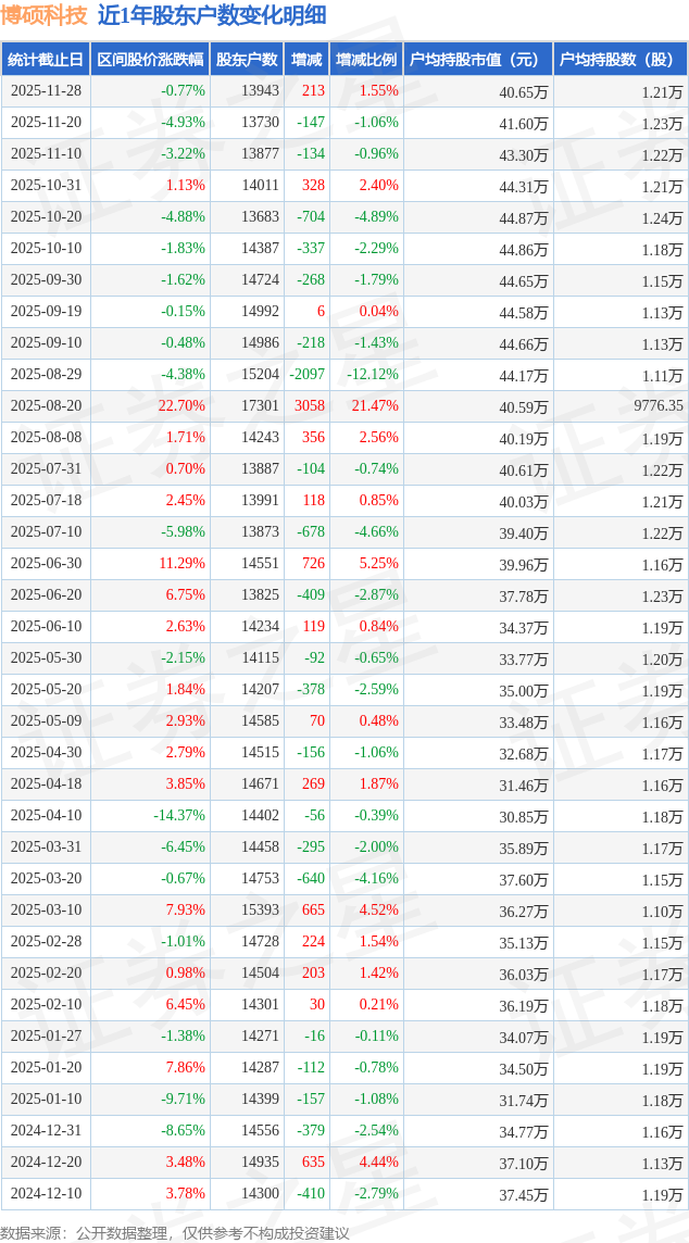 从股价来看,2025年11月20日至2025年11月28日,博硕科技区间跌幅为0.77%,在此期间股东户数增加213.0户,增幅为1.55%。