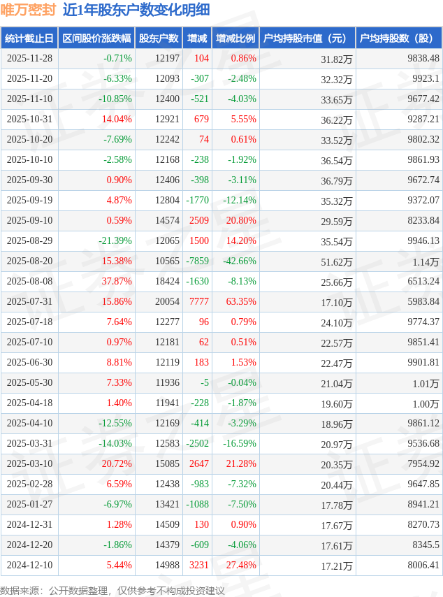 从股价来看,2025年11月20日至2025年11月28日,唯万密封区间跌幅为0.71%,在此期间股东户数增加104.0户,增幅为0.86%。