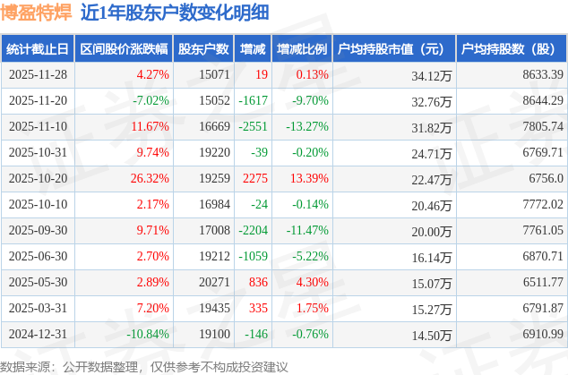 从股价来看,2025年11月20日至2025年11月28日,博盈特焊区间涨幅为4.27%,在此期间股东户数增加19.0户,增幅为0.13%。