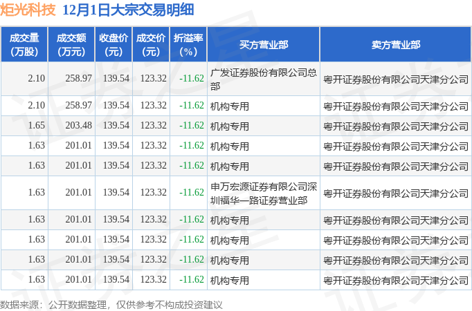 证券之星消息,12月1日炬光科技发生大宗交易,交易数据如下: