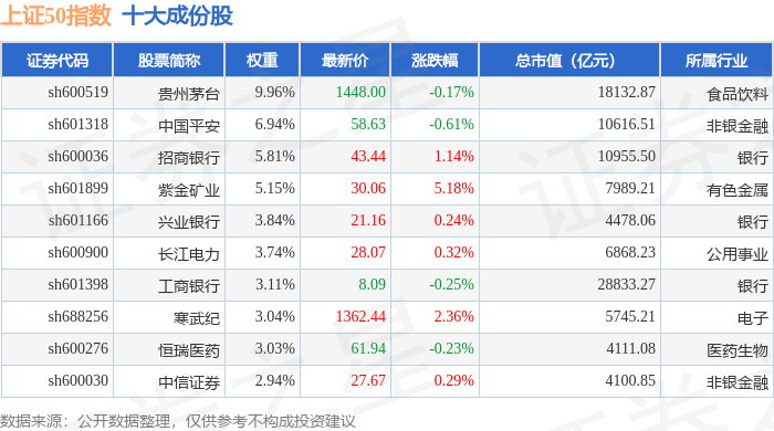 上证50(000016)指数十大成份股详情如下: