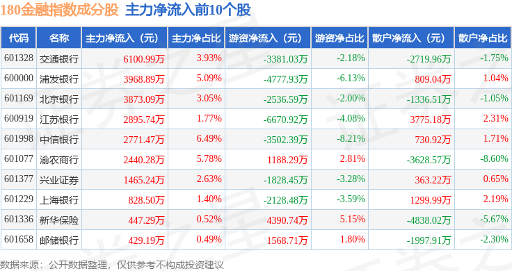 资金流向方面,180金融(000018)指数成份股当日主力资金净流出合计10.69亿元,游资资金净流出合计2.14亿元,散户资金净流入合计12.83亿元。成份股资金流向详情见下表: