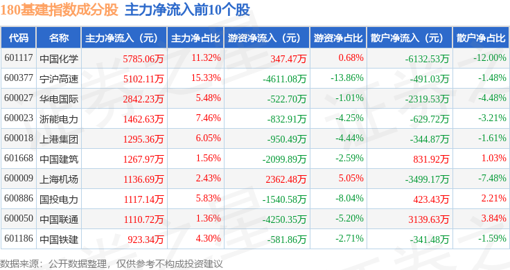 资金流向方面,180基建(000025)指数成份股当日主力资金净流出合计6.19亿元,游资资金净流入合计3.3亿元,散户资金净流入合计2.89亿元。成份股资金流向详情见下表: