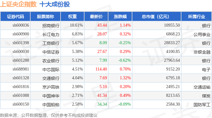 上证央企(000042)指数十大成份股详情如下: