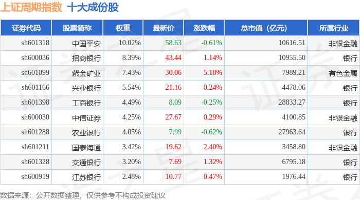 证券之星消息,12月1日,上证周期(000063)指数报收于3920.79点,涨1.06%,成交824.33亿元,换手率0.33%。当日该指数成份股中,上涨的有36家,洛阳钼业以6.53%的涨幅领涨,下跌的有11家,中国人保以4.97%的跌幅领跌。
