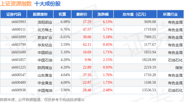 证券之星消息,12月1日,上证资源(000068)指数报收于3826.8点,涨2.66%,成交651.02亿元,换手率0.77%。当日该指数成份股中,上涨的有44家,江西铜业以9.16%的涨幅领涨,下跌的有3家,淮北矿业以2.03%的跌幅领跌。