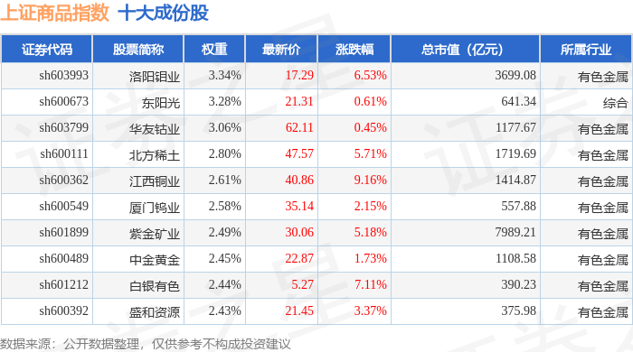 上证商品(000066)指数十大成份股详情如下: