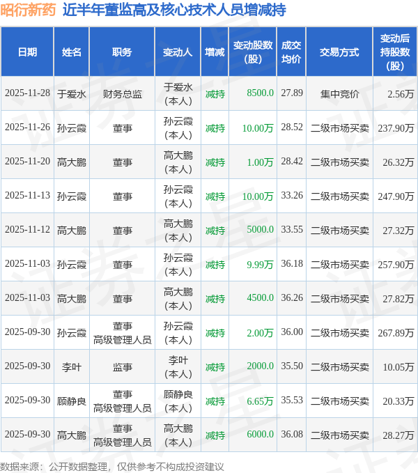 昭衍新药近半年内的董监高及核心技术人员增减持详情如下: