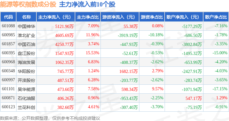 资金流向方面,能源等权(000070)指数成份股当日主力资金净流出合计6497.24万元,游资资金净流入合计1.34亿元,散户资金净流出合计6864.98万元。成份股资金流向详情见下表: