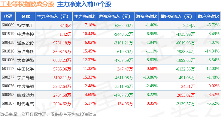 资金流向方面,工业等权(000072)指数成份股当日主力资金净流出合计2.32亿元,游资资金净流出合计2.12亿元,散户资金净流入合计4.44亿元。成份股资金流向详情见下表: