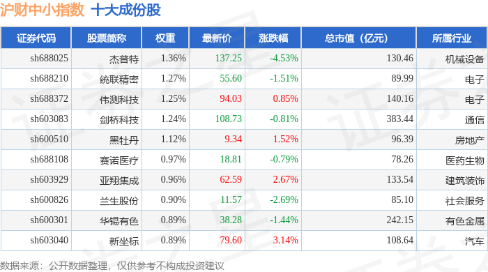 证券之星消息,12月1日,沪财中小(000091)指数报收于14201.73点,涨0.75%,成交416.8亿元,换手率2.27%。当日该指数成份股中,上涨的有134家,华培动力以10.01%的涨幅领涨,下跌的有60家,百傲化学以5.57%的跌幅领跌。