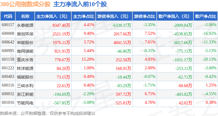 资金流向方面,380公用(000113)指数成份股当日主力资金净流出合计11.1亿元,游资资金净流入合计3.92亿元,散户资金净流入合计7.18亿元。成份股资金流向详情见下表: