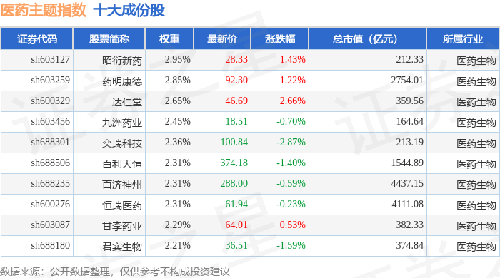 证券之星消息,12月1日,医药主题(000121)指数报收于8291.05点,涨0.55%,成交148.72亿元,换手率0.79%。当日该指数成份股中,上涨的有37家,大参林以3.45%的涨幅领涨,下跌的有12家,奕瑞科技以2.87%的跌幅领跌。