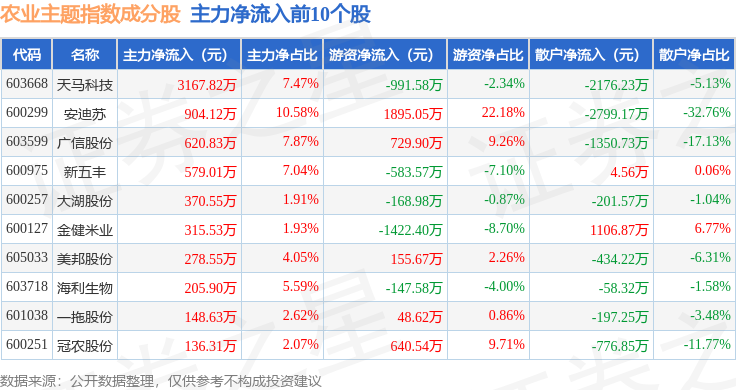 资金流向方面,农业主题(000122)指数成份股当日主力资金净流出合计1.68亿元,游资资金净流入合计1.1亿元,散户资金净流入合计5848.29万元。成份股资金流向详情见下表: