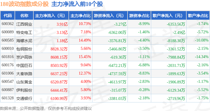 资金流向方面,180波动(000129)指数成份股当日主力资金净流出合计12.24亿元,游资资金净流入合计8813.74万元,散户资金净流入合计11.35亿元。成份股资金流向详情见下表: