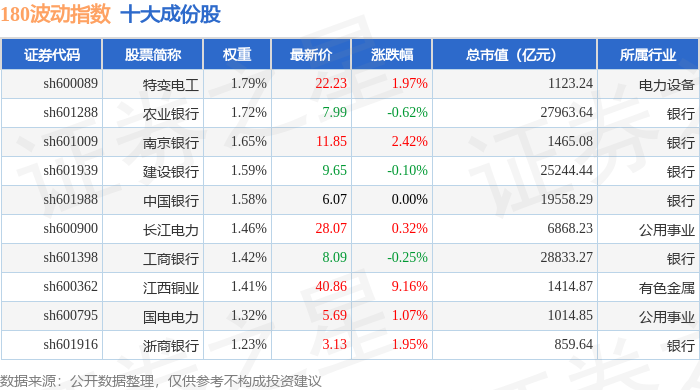 证券之星消息,12月1日,180波动(000129)指数报收于15406.92点,涨0.87%,成交915.62亿元,换手率0.37%。当日该指数成份股中,上涨的有79家,江西铜业以9.16%的涨幅领涨,下跌的有20家,中国人保以4.97%的跌幅领跌。