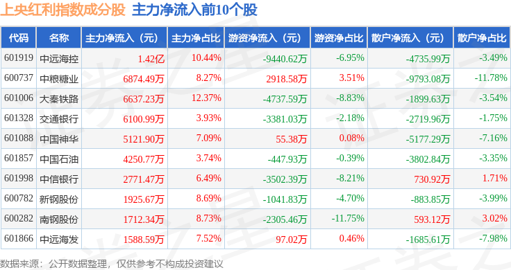 资金流向方面,上央红利(000152)指数成份股当日主力资金净流出合计5.95亿元,游资资金净流入合计2.1亿元,散户资金净流入合计3.86亿元。成份股资金流向详情见下表: