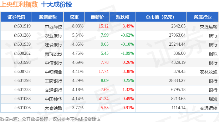 证券之星消息,12月1日,上央红利(000152)指数报收于2938.19点,涨0.77%,成交254.28亿元,换手率0.2%。当日该指数成份股中,上涨的有19家,中远海控以3.49%的涨幅领涨,下跌的有10家,保利发展以2.07%的跌幅领跌。