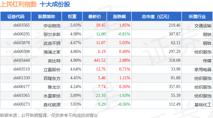 证券之星消息,12月1日,上民红利(000153)指数报收于3136.44点,涨0.78%,成交50.93亿元,换手率1.1%。当日该指数成份股中,上涨的有20家,中创物流以6.76%的涨幅领涨,下跌的有8家,新澳股份以1.96%的跌幅领跌。