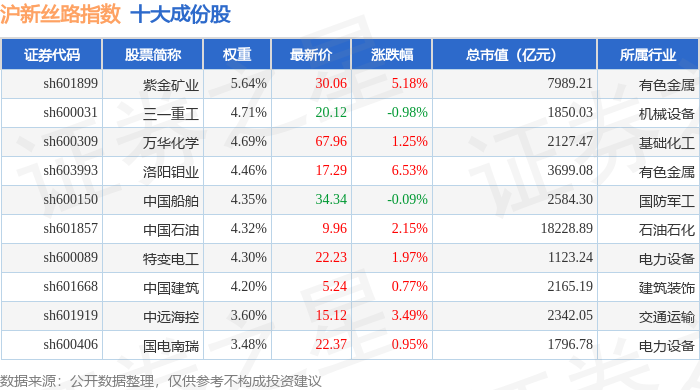 证券之星消息,12月1日,沪新丝路(000160)指数报收于2058.26点,涨1.68%,成交681.26亿元,换手率0.76%。当日该指数成份股中,上涨的有48家,招商轮船以9.65%的涨幅领涨,下跌的有20家,上海电力以6.11%的跌幅领跌。