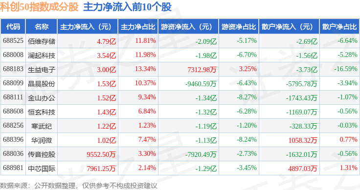 资金流向方面,科创50(000688)指数成份股当日主力资金净流入合计11.02亿元,游资资金净流出合计2.51亿元,散户资金净流出合计8.51亿元。成份股资金流向详情见下表: