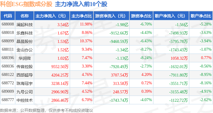 资金流向方面,科创ESG(000691)指数成份股当日主力资金净流入合计2.8亿元,游资资金净流入合计1.33亿元,散户资金净流出合计4.13亿元。成份股资金流向详情见下表: