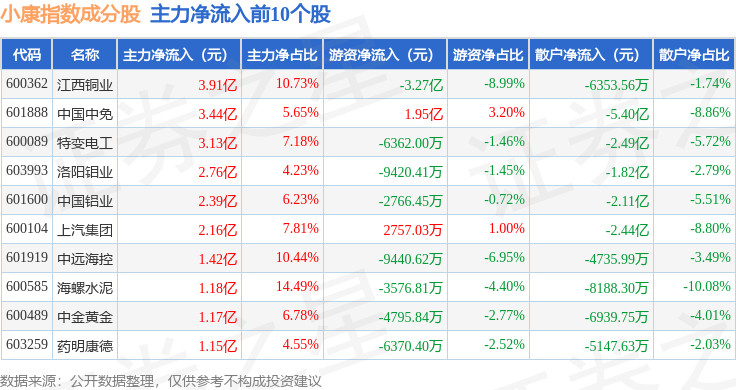 资金流向方面,小康指数(000901)成份股当日主力资金净流入合计7.07亿元,游资资金净流出合计2.32亿元,散户资金净流出合计4.75亿元。成份股资金流向详情见下表:
