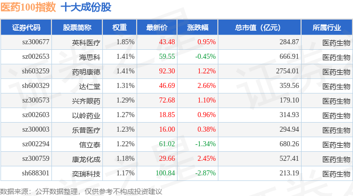 证券之星消息,12月1日,医药100(000978)指数报收于10906.68点,涨0.55%,成交285.38亿元,换手率0.8%。当日该指数成份股中,上涨的有75家,江中药业以4.37%的涨幅领涨,下跌的有22家,奕瑞科技以2.87%的跌幅领跌。