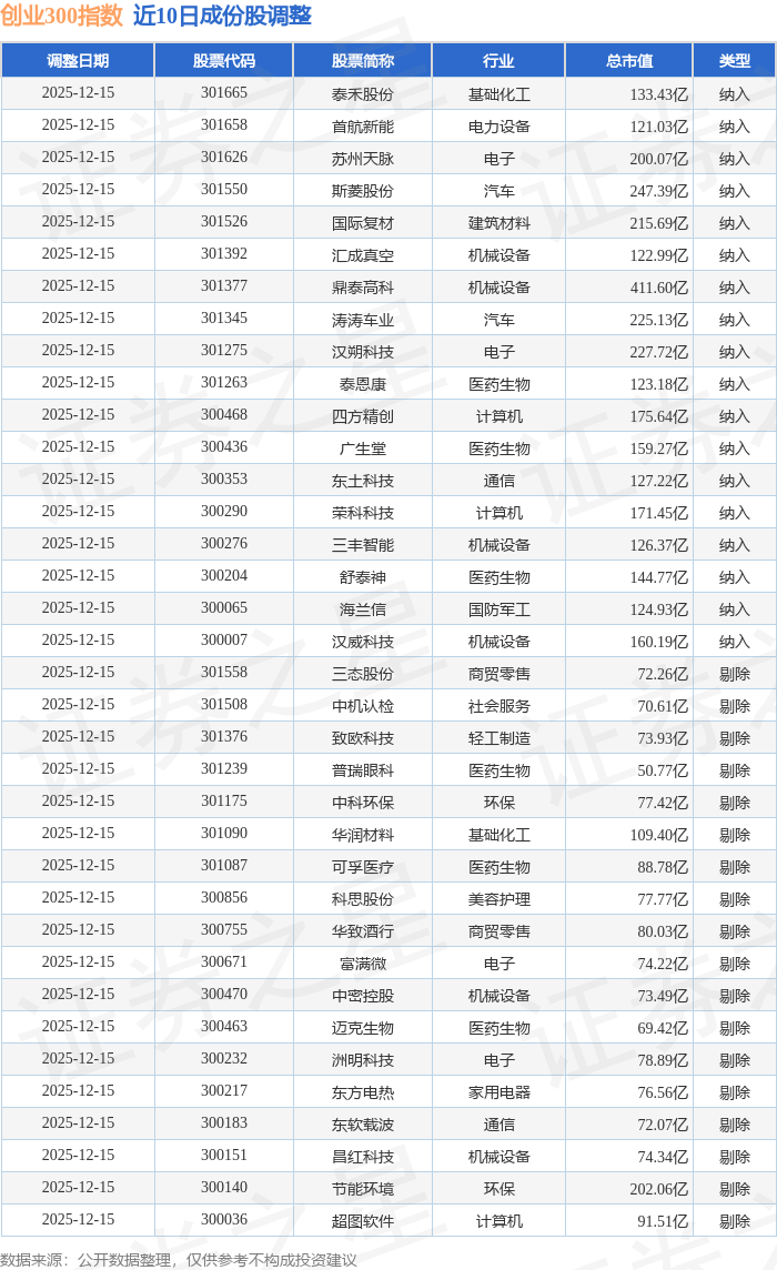 近10日内创业300(399012)指数成份股做了调整,新纳入了18只股票,剔除了18只股票。