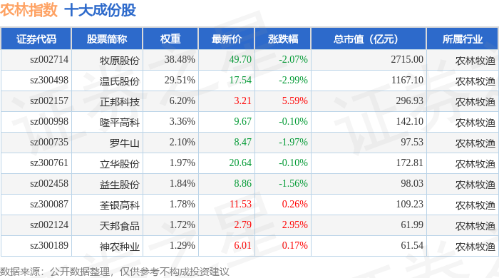 证券之星消息,12月1日,农林指数(399231)报收于1416.63点,跌1.3%,成交98.48亿元,换手率3.73%。当日该指数成份股中,上涨的有11家,正邦科技以5.59%的涨幅领涨,下跌的有14家,温氏股份以2.99%的跌幅领跌。