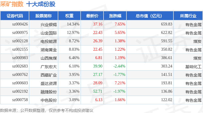 证券之星消息,12月1日,采矿指数(399232)报收于3928.63点,涨2.19%,成交188.52亿元,换手率2.88%。当日该指数成份股中,上涨的有21家,兴业银锡以7.65%的涨幅领涨,下跌的有8家,大中矿业以4.35%的跌幅领跌。
