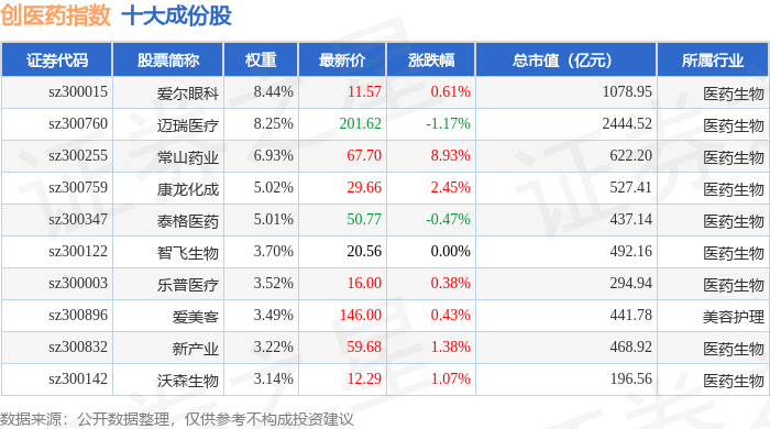 证券之星消息,12月1日,创医药(399275)指数报收于2740.12点,涨1.04%,成交136.61亿元,换手率1.36%。当日该指数成份股中,上涨的有38家,常山药业以8.93%的涨幅领涨,下跌的有10家,百普赛斯以3.65%的跌幅领跌。