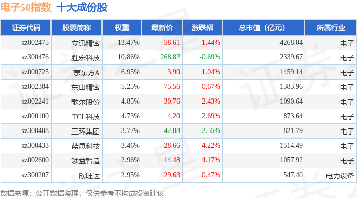 电子50(399281)指数十大成份股详情如下: