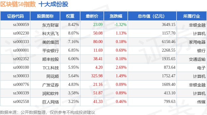 证券之星消息,12月1日,区块链50(399286)指数报收于3962.34点,涨0.54%,成交409.86亿元,换手率2.04%。当日该指数成份股中,上涨的有30家,汉得信息以4.43%的涨幅领涨,下跌的有20家,国投智能以4.88%的跌幅领跌。