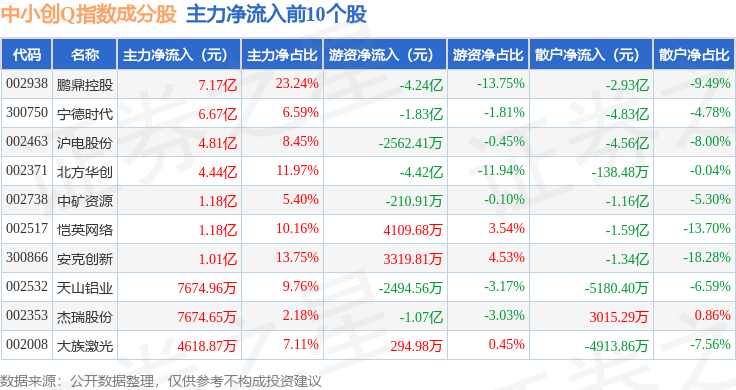 资金流向方面,中小创Q(399294)指数成份股当日主力资金净流入合计5.37亿元,游资资金净流出合计3603.45万元,散户资金净流出合计5.01亿元。成份股资金流向详情见下表: