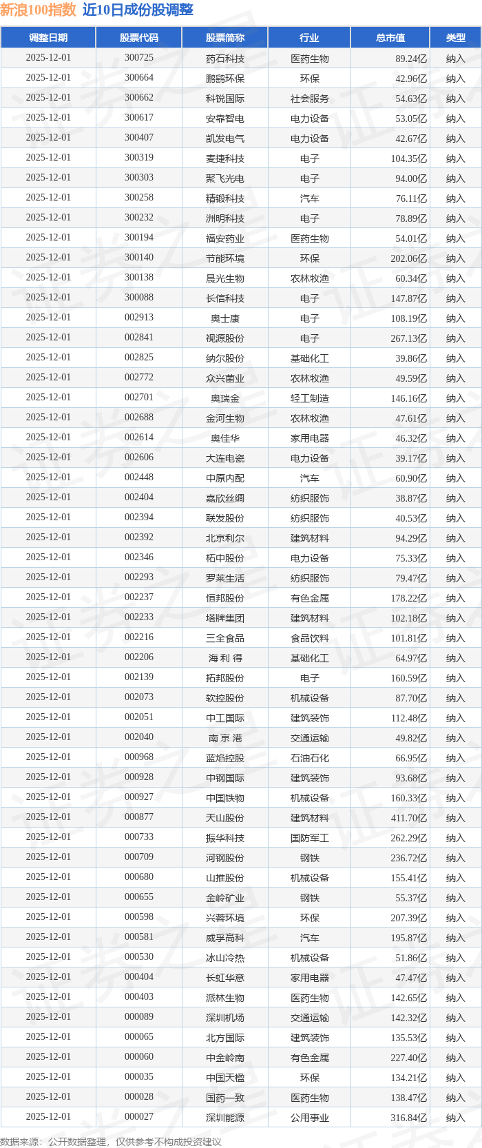 近10日内新浪100(399297)指数成份股做了调整,新纳入了54只股票。