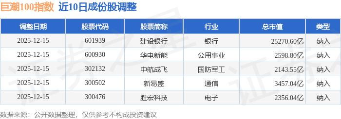 近10日内巨潮100(399313)指数成份股做了调整,新纳入了5只股票。