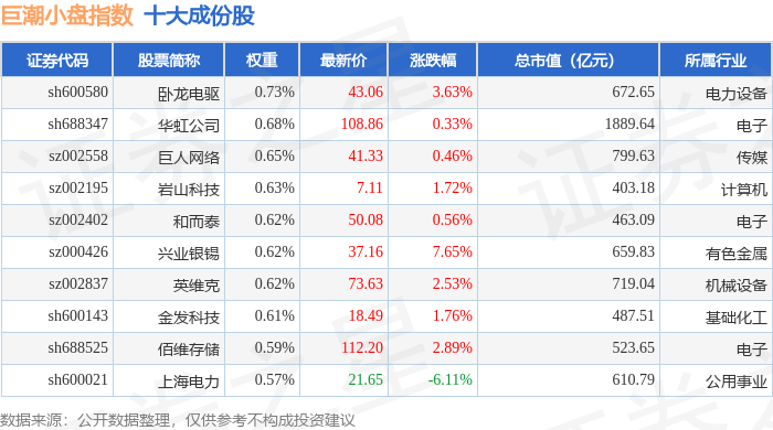 证券之星消息,12月1日,巨潮小盘(399316)指数报收于5779.42点,涨0.94%,成交2562.03亿元,换手率1.7%。当日该指数成份股中,上涨的有343家,森马服饰以10.05%的涨幅领涨,下跌的有136家,惠城环保以11.4%的跌幅领跌。